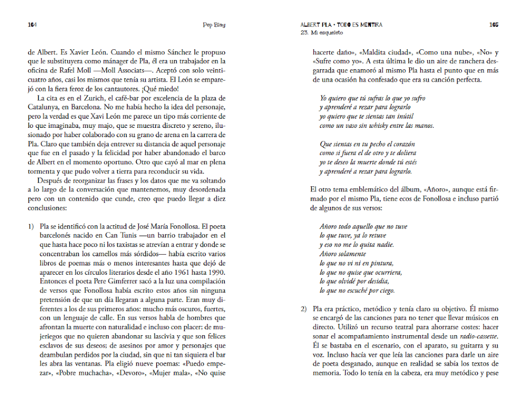 Con prólogo del mismo Albert Pla, Todo es mentira relata la brillante, ajetreada y controvertida trayectoria del ‘cantactor’ que ha escrito una página dorada en la historia de la música popular.