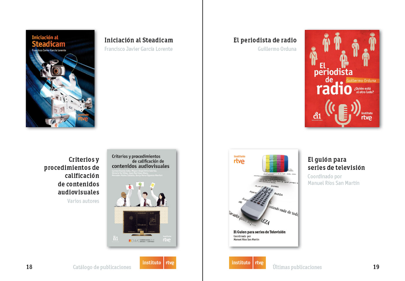 Diseño, maquetación y portada del nuevo catálogo de publicaciones del Instituto Radio televisión Española (RTVE), que además contiene algunas de nuestras portadas para esta entidad.