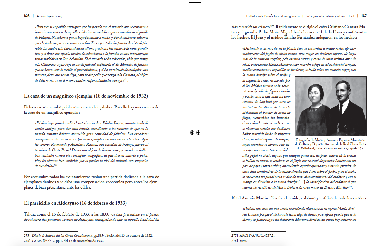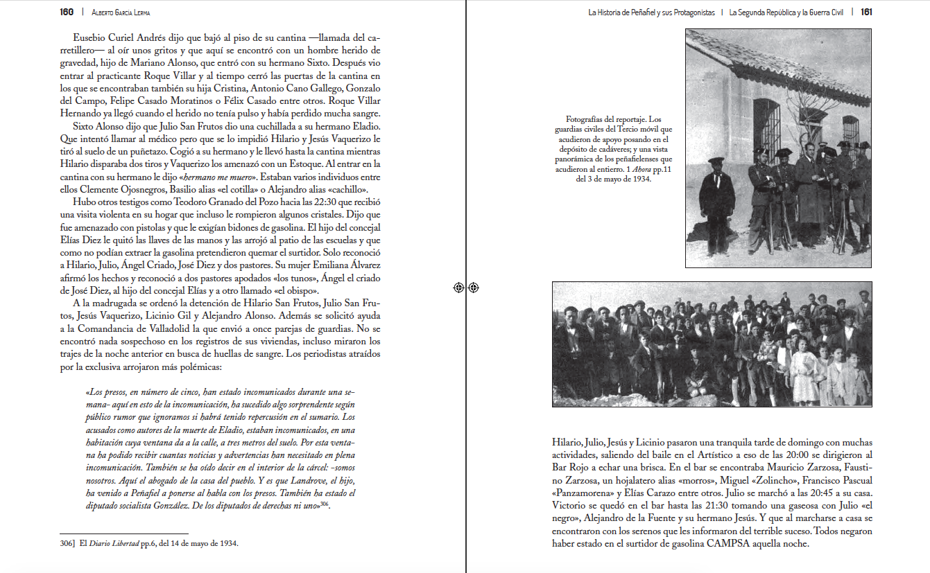 La historia de Peñafiel y sus protagonistas. La Segunda República y la Guerra Civil (1931-1939), de Alberto García Lerma, constituye un nuevo ejemplo de autoedición y de los retos que afrontamos. Tablas, gráficos, fotografías, texto, citas exentas, notas a pie de página… conviven en esta obra diseñada y maquetada por Rasgo Audaz. También nos ocupamos de la cubierta a partir de la ilustración de Alejandro Romera.