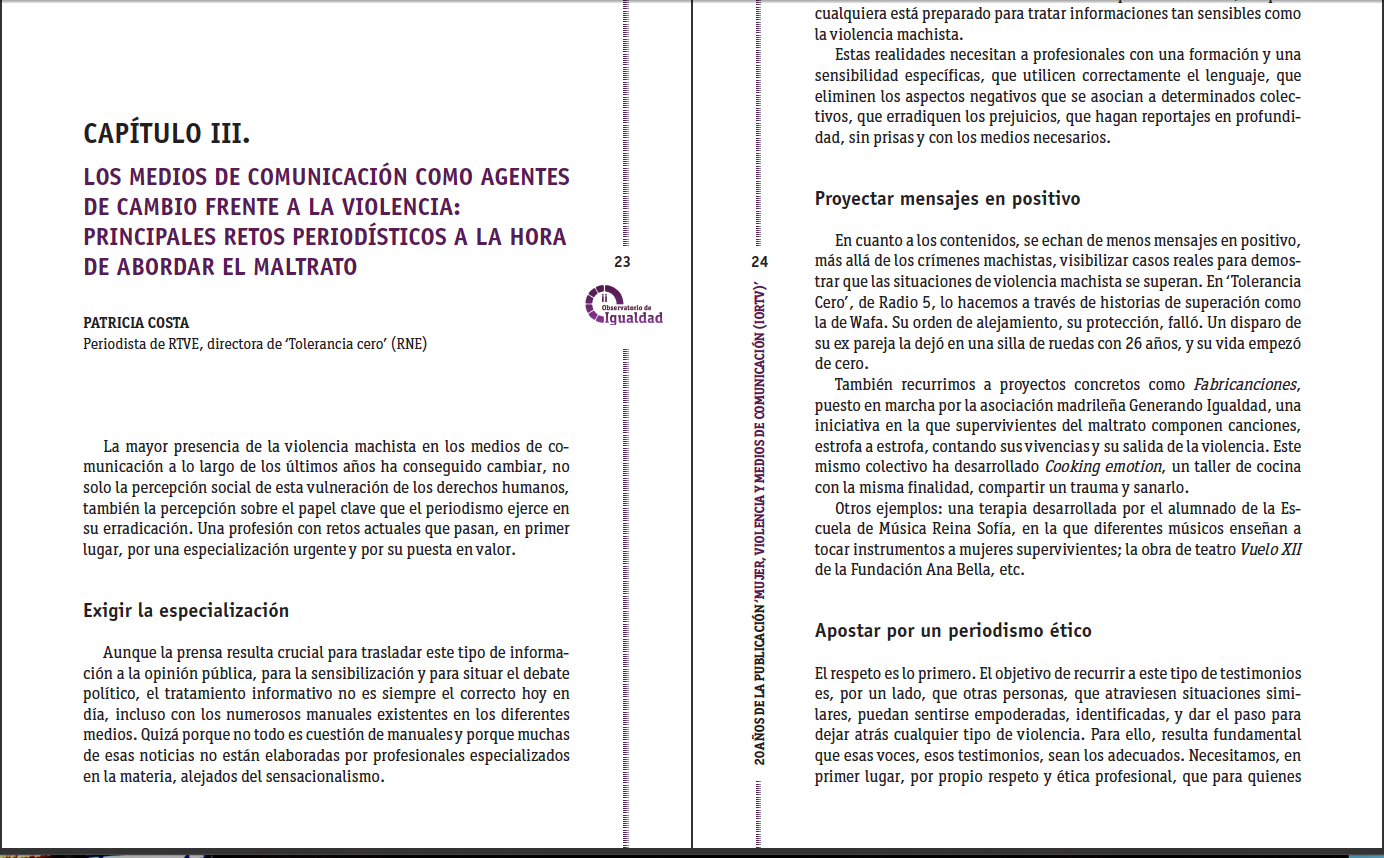 Con motivo del 25N, Día Internacional de la Eliminación de la Violencia contra la Mujer, el Observatorio de Igualdad de RTVE organizó el 24 de noviembre de 2022 el evento «20 años de la publicación ‘Mujer, Violencia y Medios de Comunicación (IOR TV)’. Formación y tratamiento de la violencia contra las mujeres», que ha dado lugar a una obra homónima dentro de la colección de publicaciones del Observatorio de Igualdad de RTVE. La publicación, diseñada y maquetada en esta casa, recoge los avances y retos a la hora de abordar el tratamiento del asunto tratado en ponencias y mesas redondas.