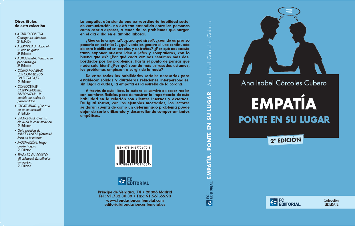 Nuevo diseño de cubierta para la colección de libros Liderate de la Fundación Confemetal: segunda edición de la obra Empatía. Ponte en su lugar, de Ana Isabel Córcoles Cubero.