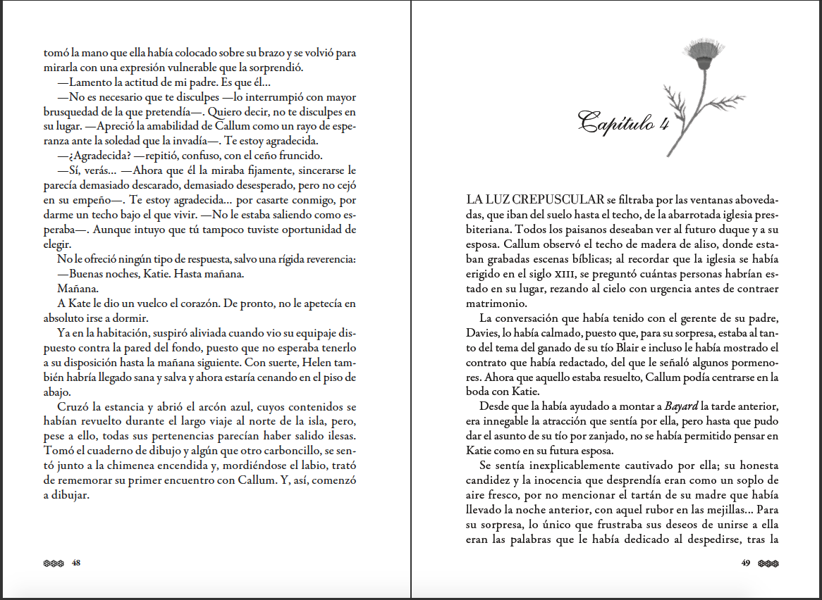 La flor nacional de Escocia, el cardo, nos ha servido de recurso gráfico en el diseño y maquetación interior de En las Tierras Altas, una novela de Heidi Kimball editada por Libros de Seda. Como otras muchas veces, realizamos también la Guía de lectura que acompaña los lanzamientos de esta editorial.