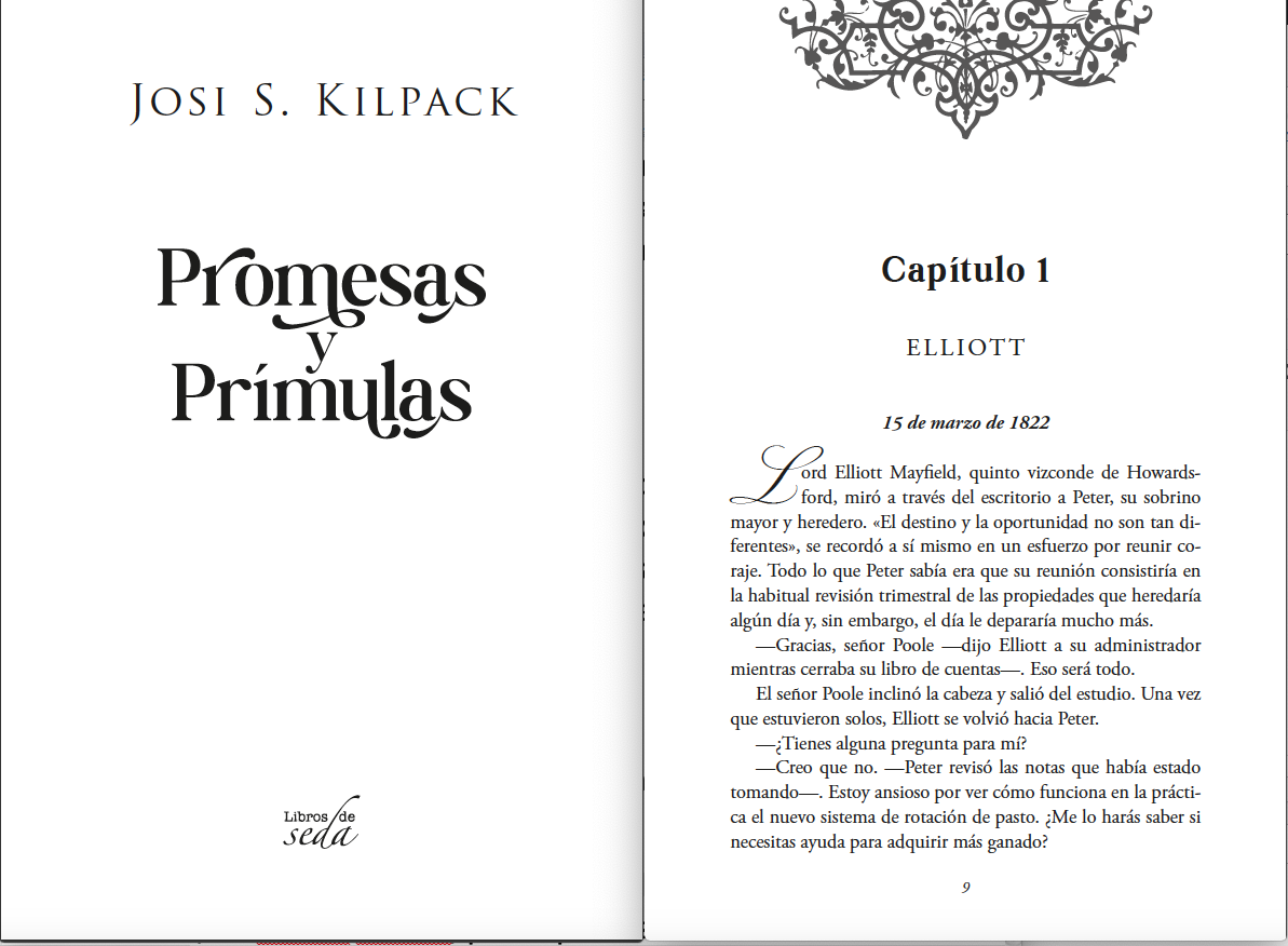 En nuestras colaboraciones con Libros de Seda ya le hemos dado forma antes a un texto de Josi S. Kilpack, La locura de lord Fenton. Volvemos a hacerlo con otra novela traducida al español: Promesas y prímulas, de la que hemos diseñado y maquetado el interior.