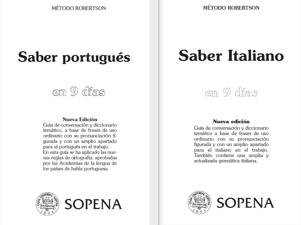 Nuevas ediciones de las guías de conversación y diccionarios temáticos Saber portugués y Saber italiano, según el denominado método Robertson. Diseño y maquetación interior de Rasgo Audaz para estos dos trabajos con frases de uso común para viajar a ambos países o para entablar relaciones laborales con hablantes de esos idioma.